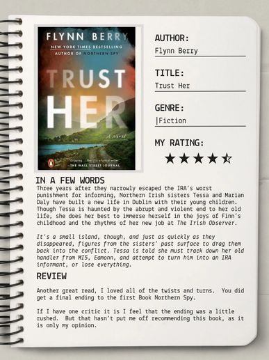 This is the second Flynn Berry book I have read, and it actually follows on from Northern Spy which I read a couple of years ago. This book didn't disappoint! I mentioned that I bought this book through Apple Books and was trialing to see if I preferred digital over paper - it was more convenient having a digital book because I could take it everywhere with me (phone or iPad), however I'm not convinced I'll stay with Apple Books.